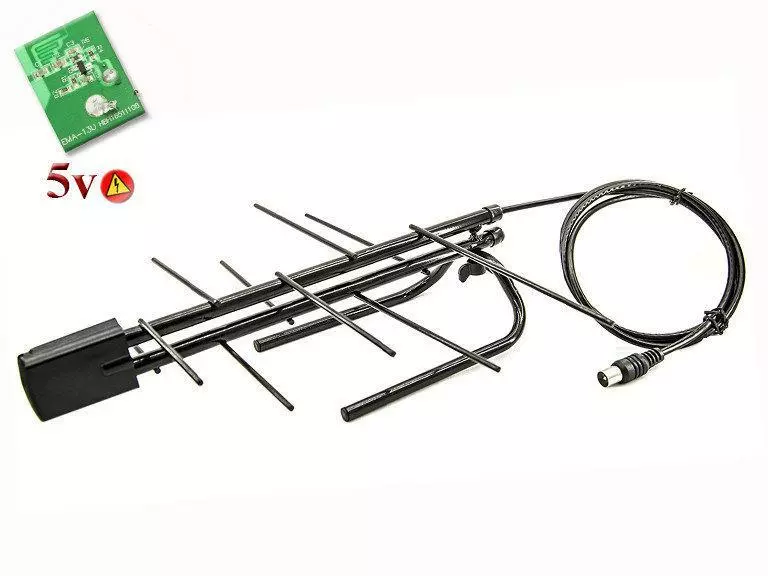 Антенна имеет встроенный усилитель с напряжением питания 5 вольт.