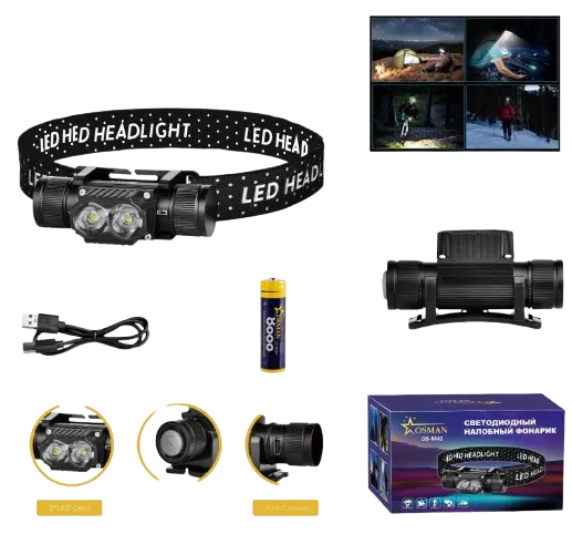 Светодиодный налобный фонарь OS-5842. размер 3.7*4.6*8.7 см.