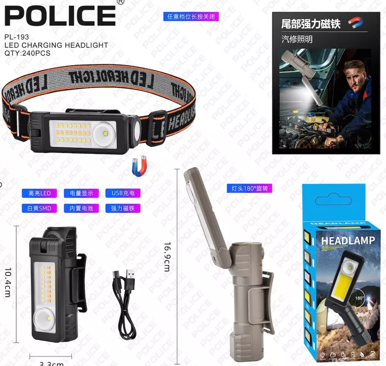 Фонарь налобный PL-193, аккумуляторный + водонепроницаемый, ЗУ