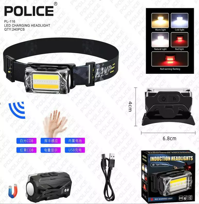 Police PL-116 - это налобный фонарь сенсорного типа, который имеет три цветовых режима: белый, желтый и красный. Он также оборудован встроенным аккумулятором, магнитом и Type-C connector.