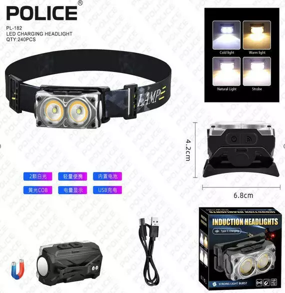 Фонарь налобный Police PL-182, белый+желтый, аккум, магнит, Type-C