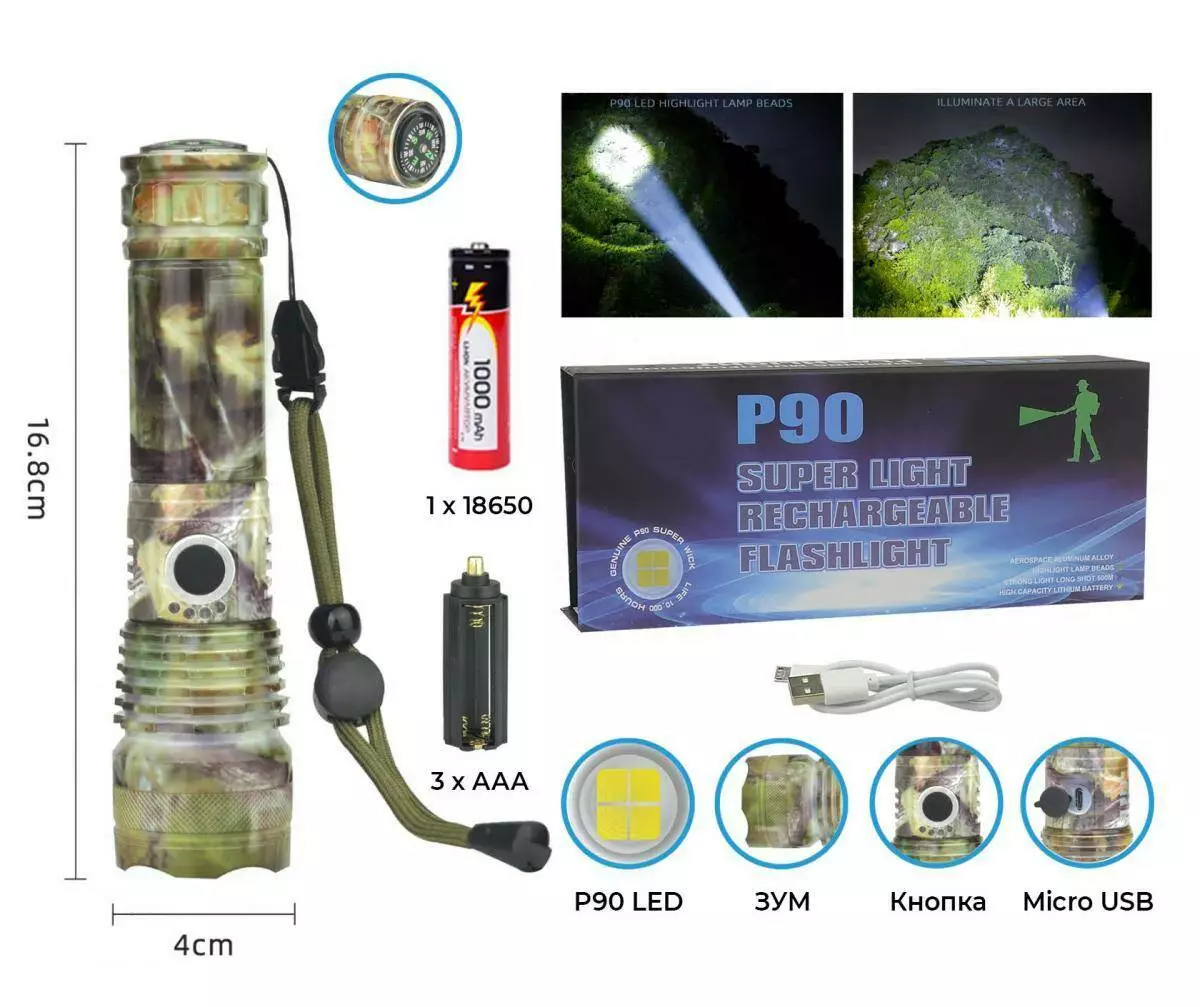 Фонарь ручной Police RB264 / P90 LED / zoom / microusb / камуфляж