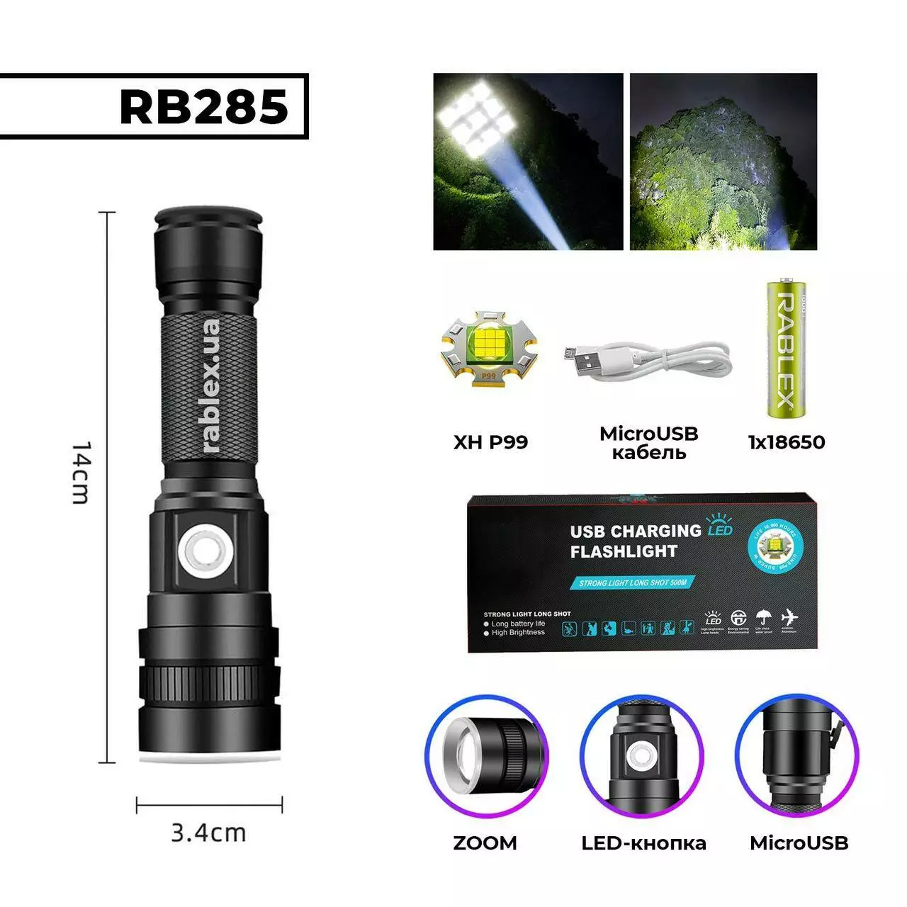 Фонарь ручной Rablex RB285 / microUSB / 18650 / XH P99