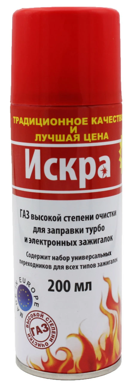 Хороший чистый газ для заправки зажигалок. В балончике объем 200 мл. Особенностью является турбо заправка. Предусмотрено набор переходников, встроенных в крышку изделия. Высота балончика 17 см.