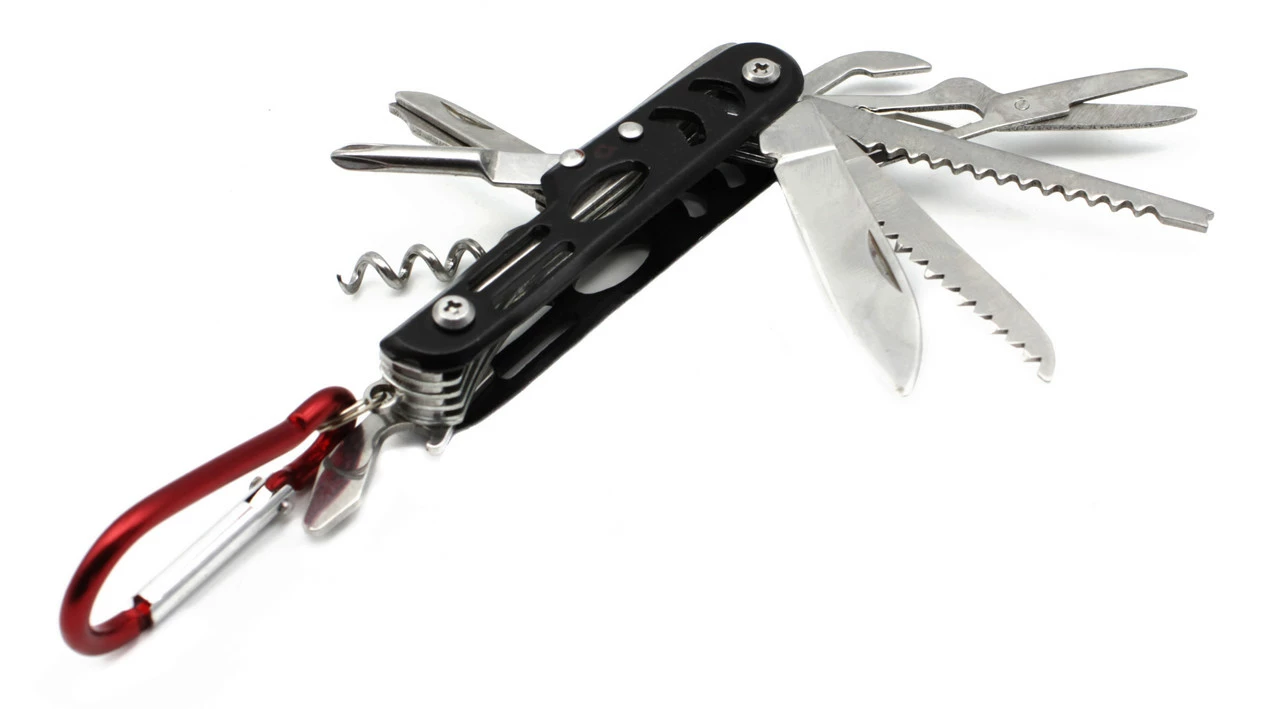 - Инструменты в комплекте: Карабин|Нож|Ножницы|Отвертка|Открывалка|Пила