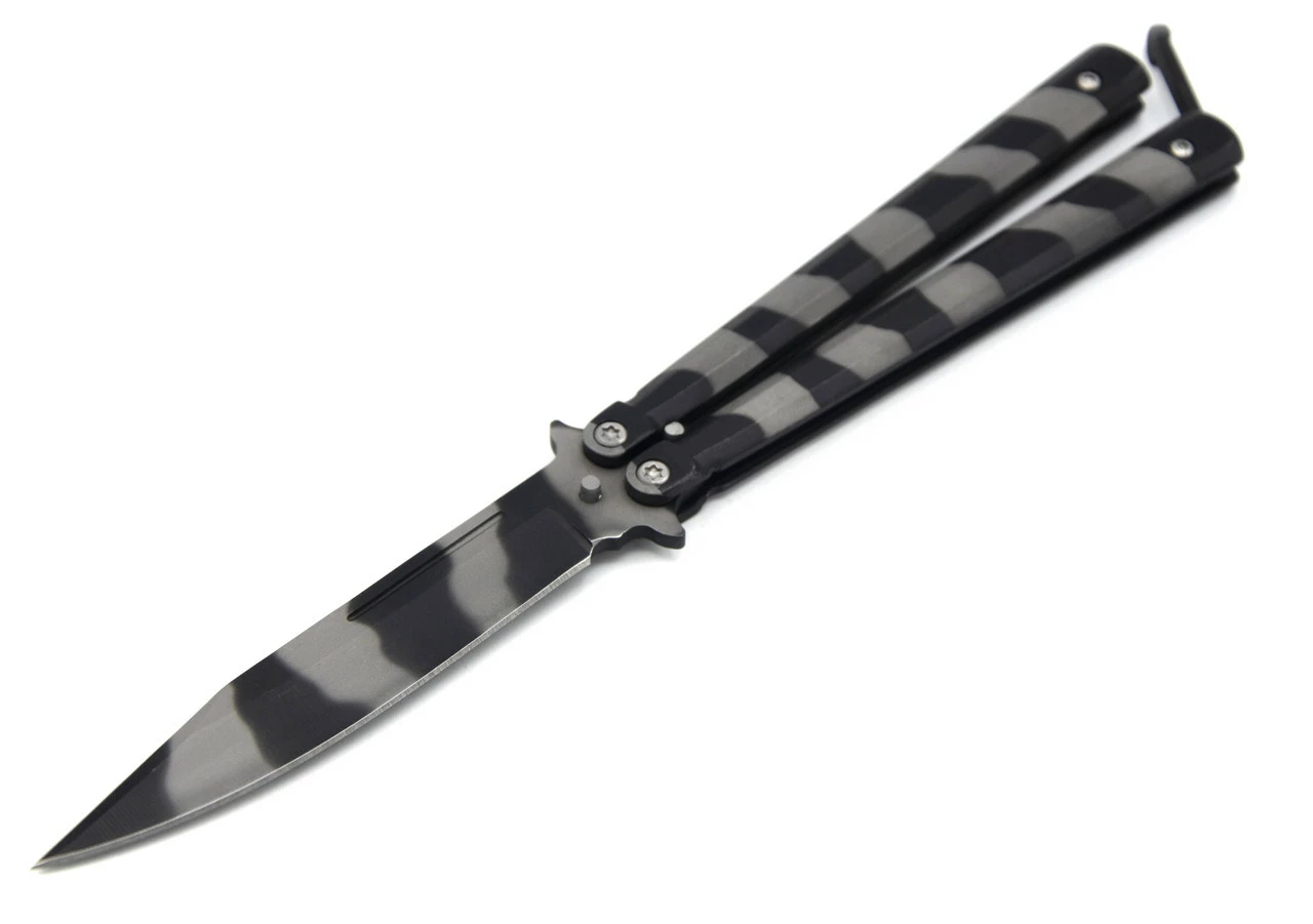 Стильный нож-бабочка. Удобный и компактный вариант для туризма. Оценят такой атрибут рыбаки и охотники. Размер в сложенном виде 13.5 см. В разложенном виде 22 см. Упакован нож в коробку. Есть предохранитель.