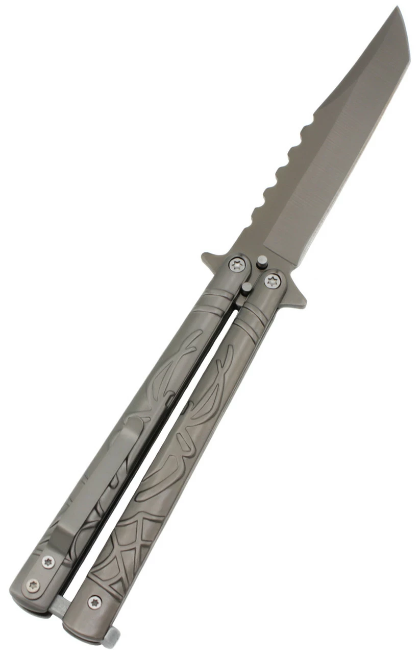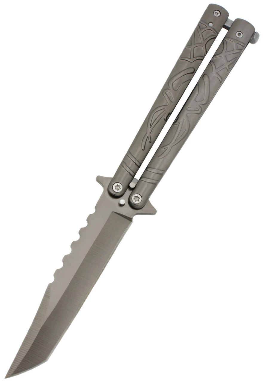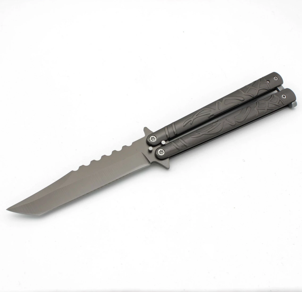 Нож бабочка выполнен в оригинальном дизайне, лезвие ножа имеет заводскую заточку, что обеспечивает долгую эксплуатацию лезвия.