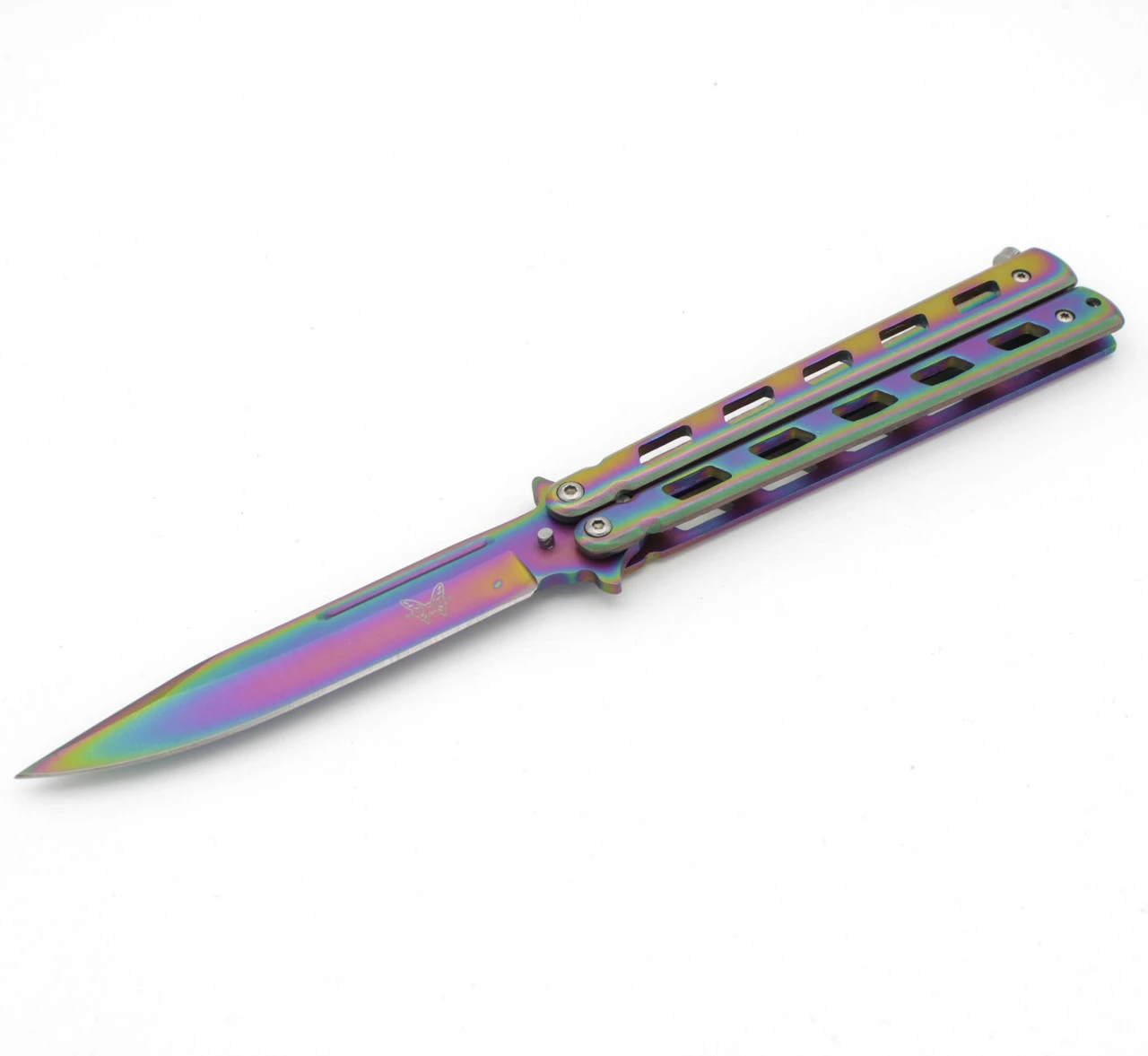 Нож бабочка серебреного цвета, легок в использование и хорошего качества.
