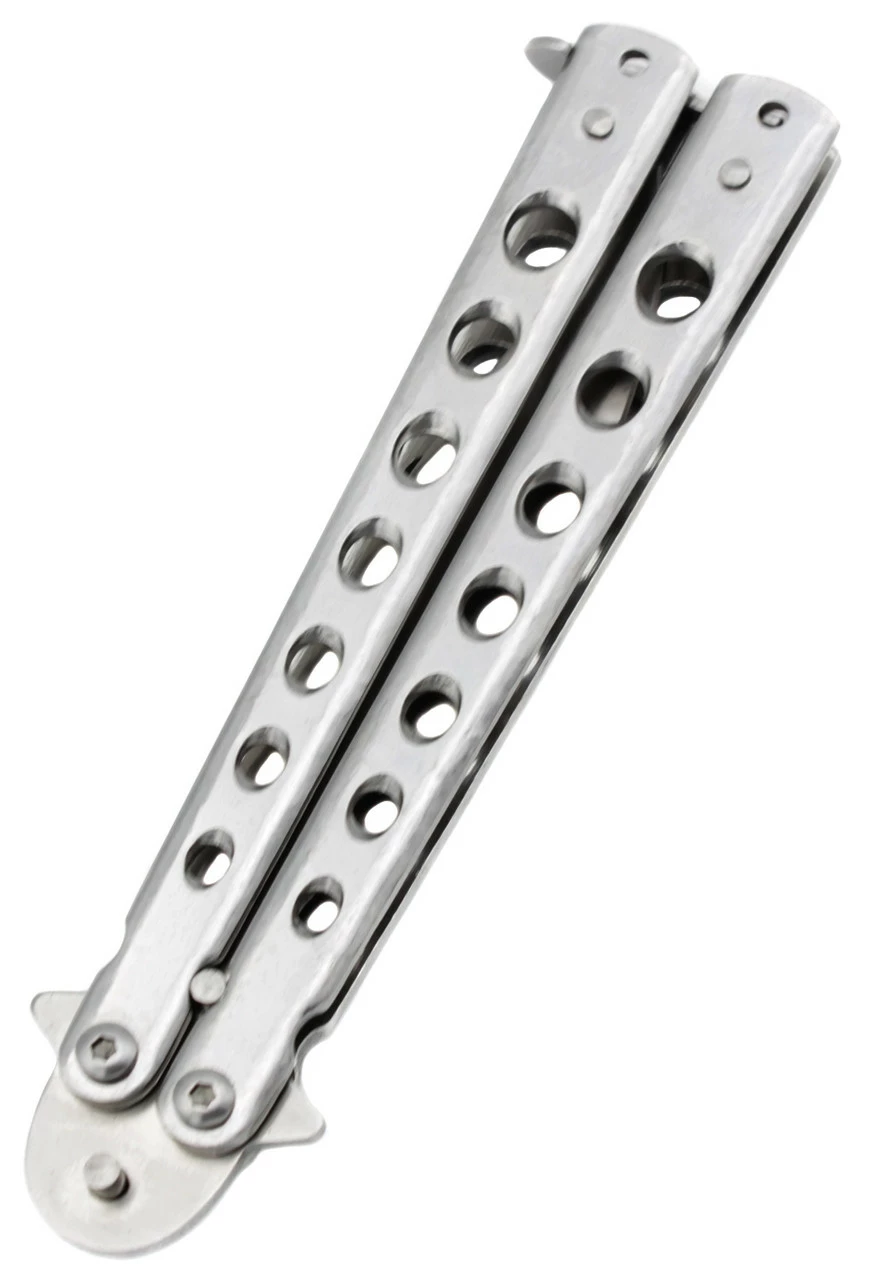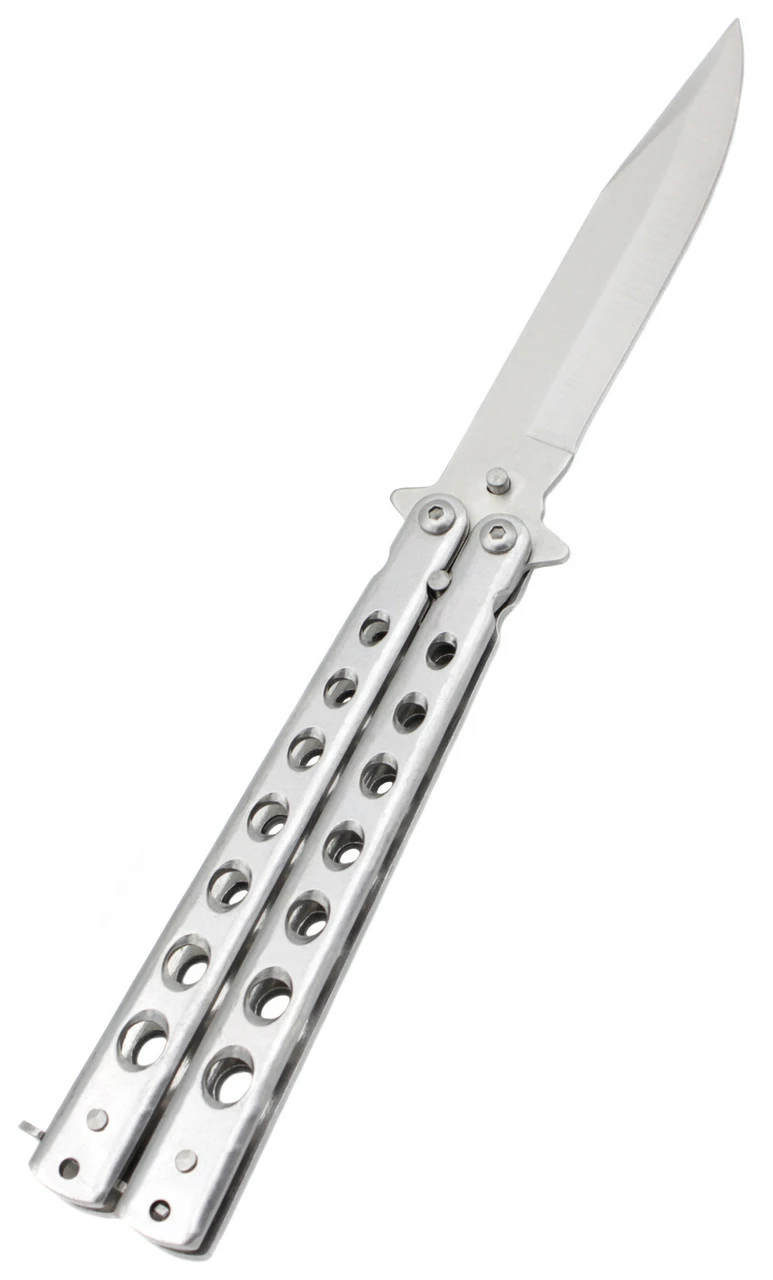 Прочный стальной нож из ряда бабочек. Заточка ножа двухсторонняя. Есть предохранитель. Размер ножа-бабочки 22.5 см. Рукоятка - 12 см. Один из надежных ножей в своем роде.