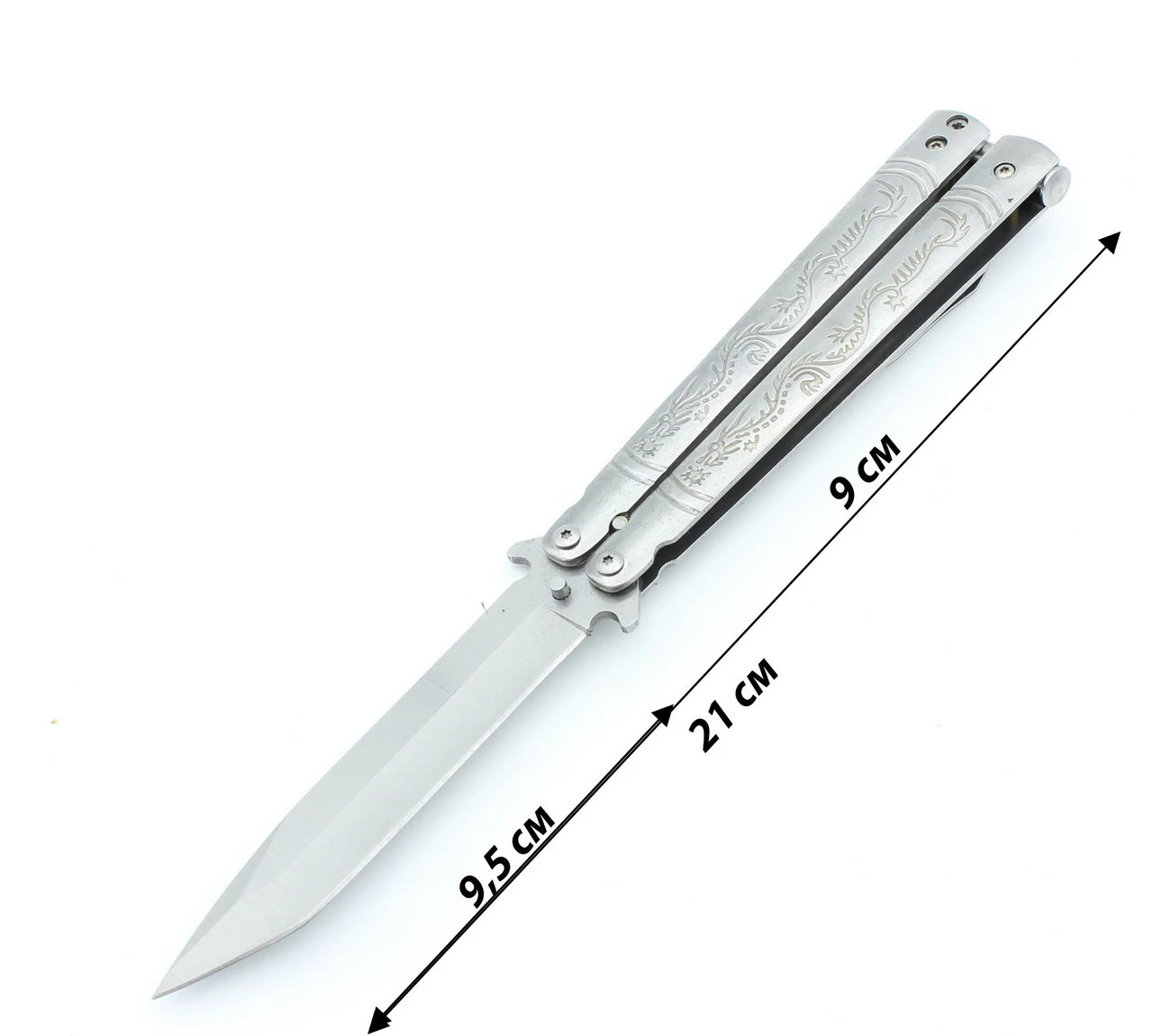 Нож бабочка выполнен в оригинальном дизайне, лезвие ножа имеет заводскую заточку, что обеспечивает долгую эксплуатацию лезвия.