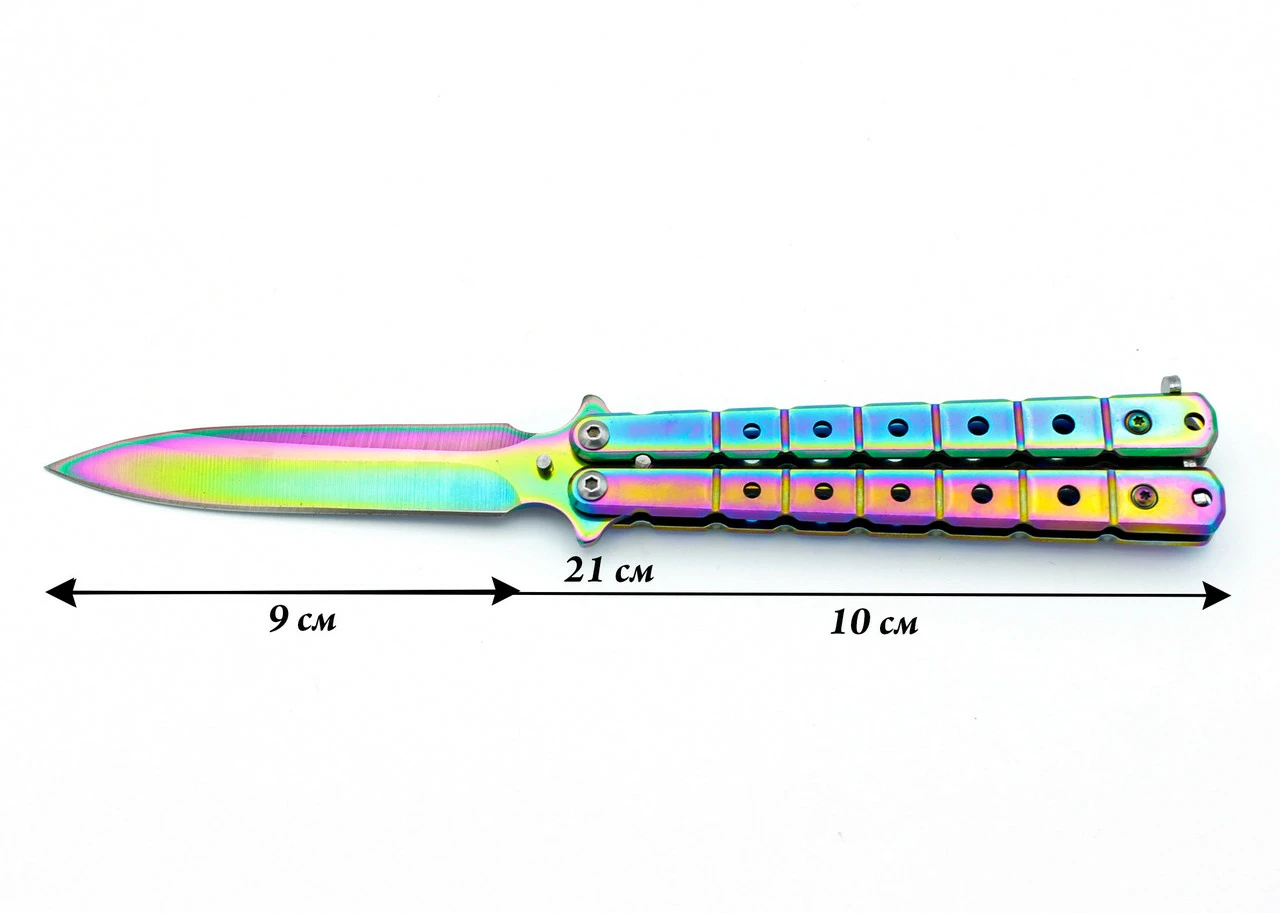 Нож бабочка выполнен в оригинальном дизайне, лезвие ножа имеет заводскую заточку, что обеспечивает долгую эксплуатацию лезвия.