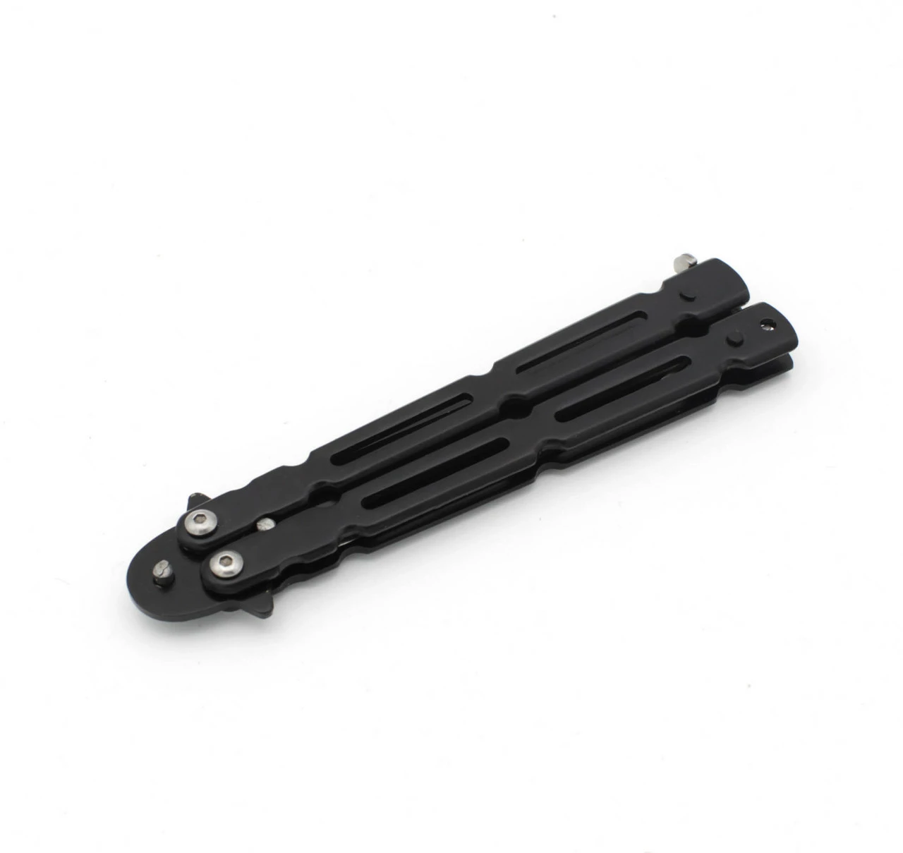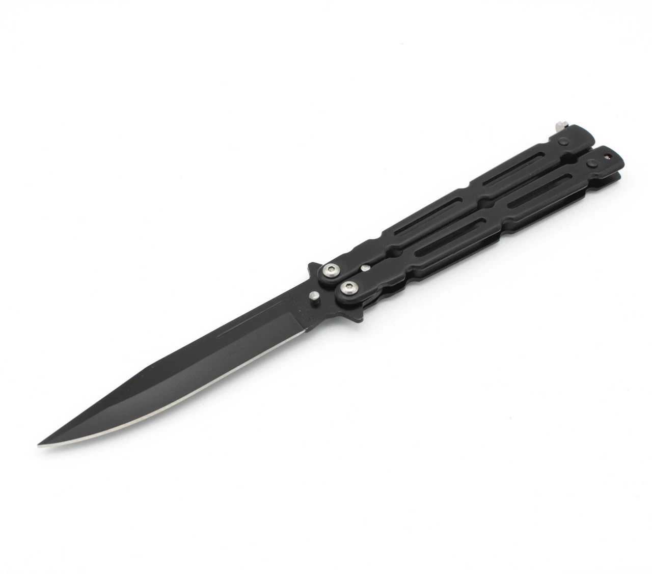 Стальная бабочка нож в черном цвете. имеет фиксатор. Упакован в коробку. Габариты ножа в разложенном виде 22см, в сложенном виде - 13 см.