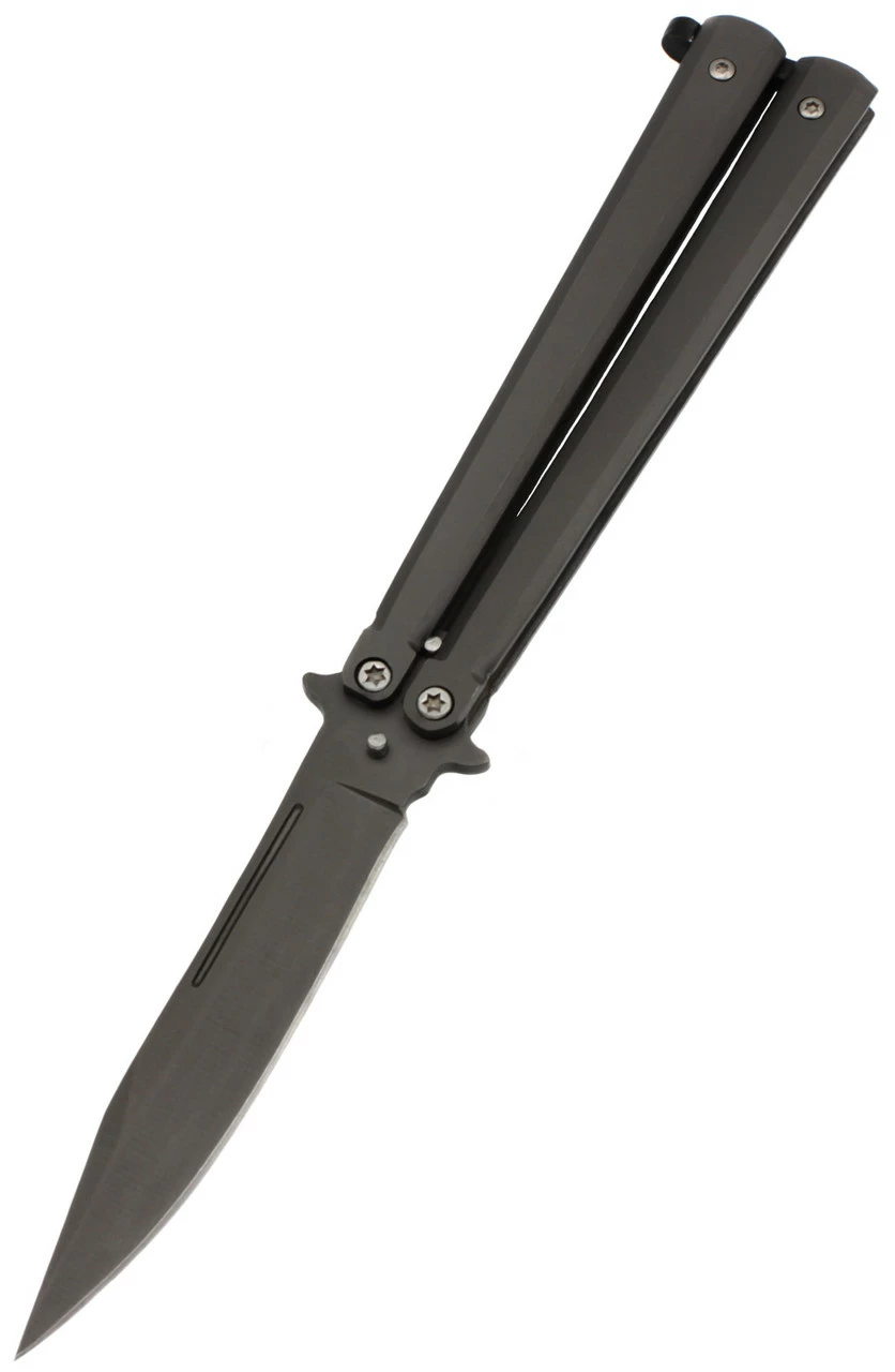 Нож- бабочка в черном матовом цвете. Упакован в коробку. размер ножа в разложенном виде 21,5 см.