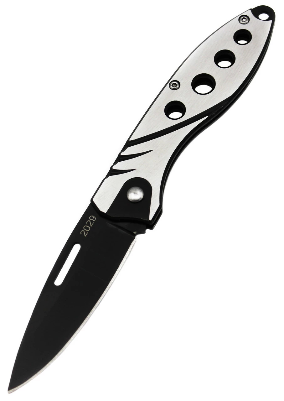Нож складной отличного качества, ручка серого цвета, лезвие черного.