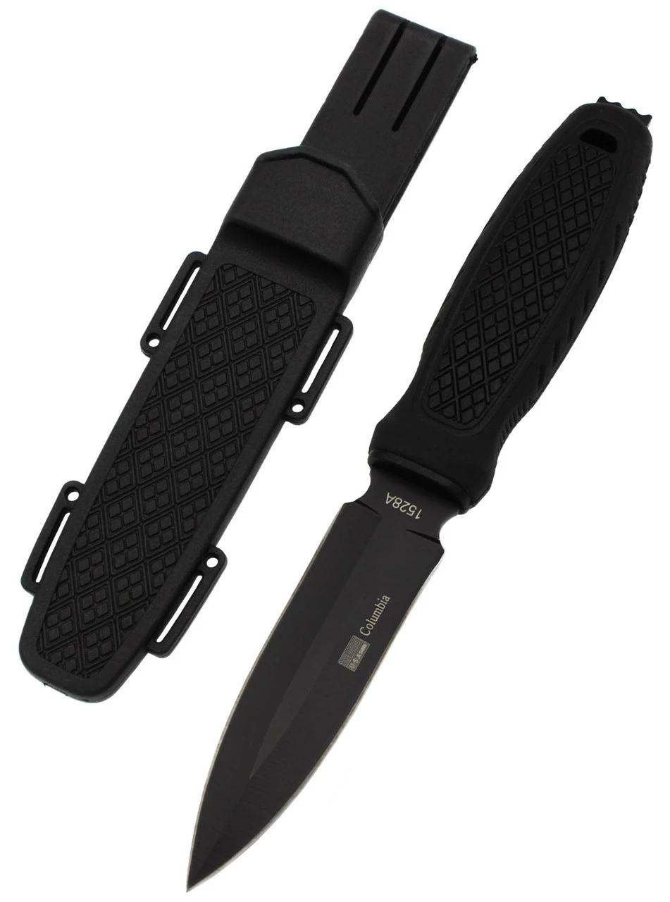 Охотничий нож фирмы Columbia, черного цвета в пластиковом чехле и пластиковой ручкой.