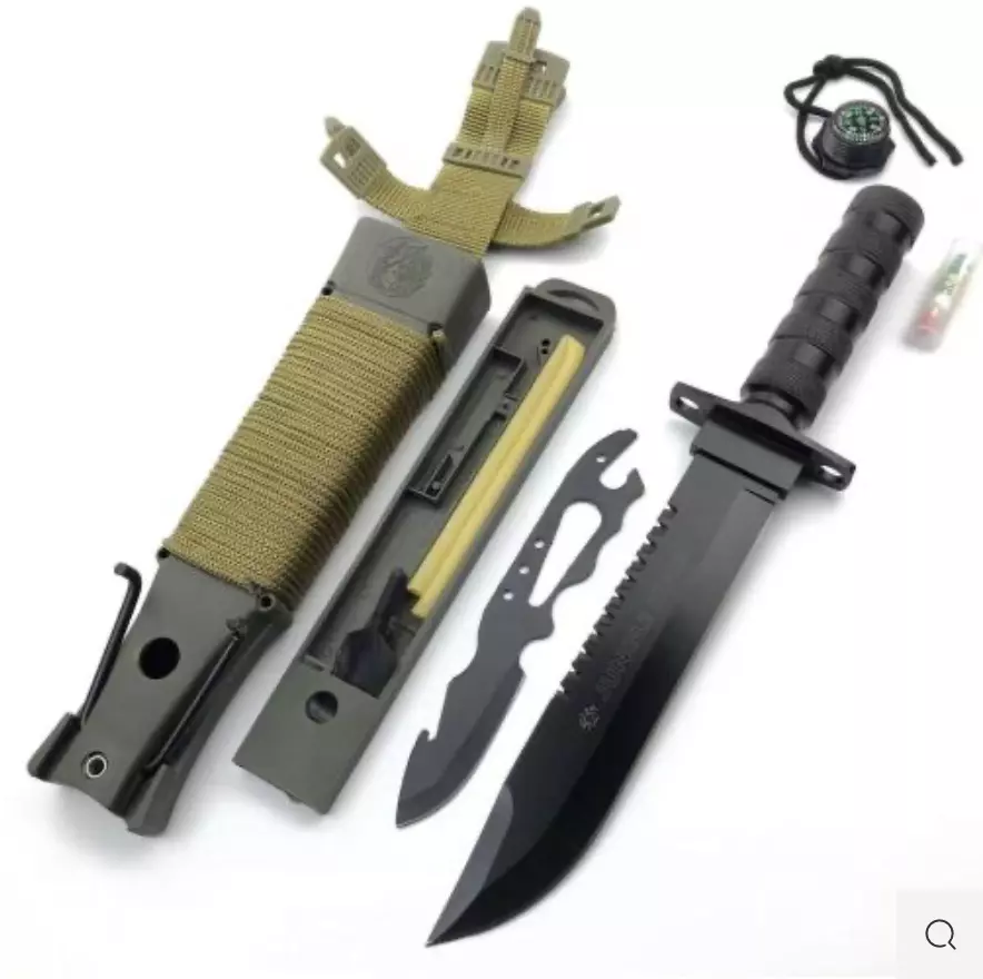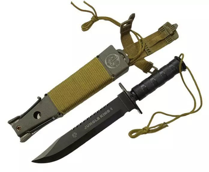 Прочный тяжелый тактический нож типа Рэмбо с предназначением для выживания. Черное лезвие изготовлено из стали 420, верхняя часть имеет очень острый мяч. Металлическая ручка, эргономичная, имеет винтовой отсек для необходимых вещей. Нож отлично лежит в руке и подойдет в самых сложных условиях. Ящик для хранения очень вместительный, в нем можно носить, например, зажигалку или карандаш.