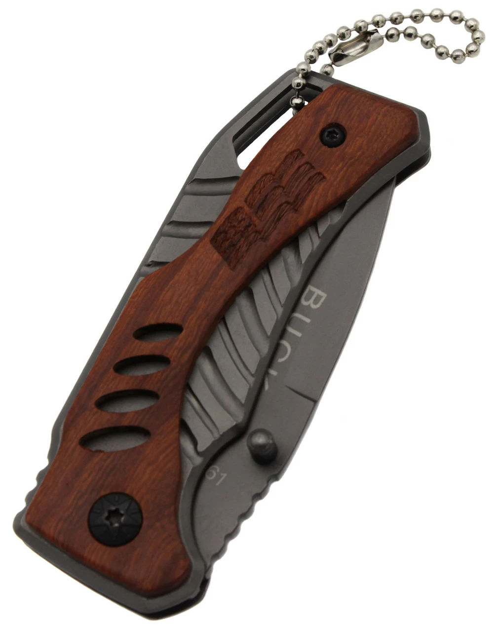 Нож складной компании Buck С нержавеющей стали и деревянной ручкой. На конце ножа есть открывачка для бутылок.