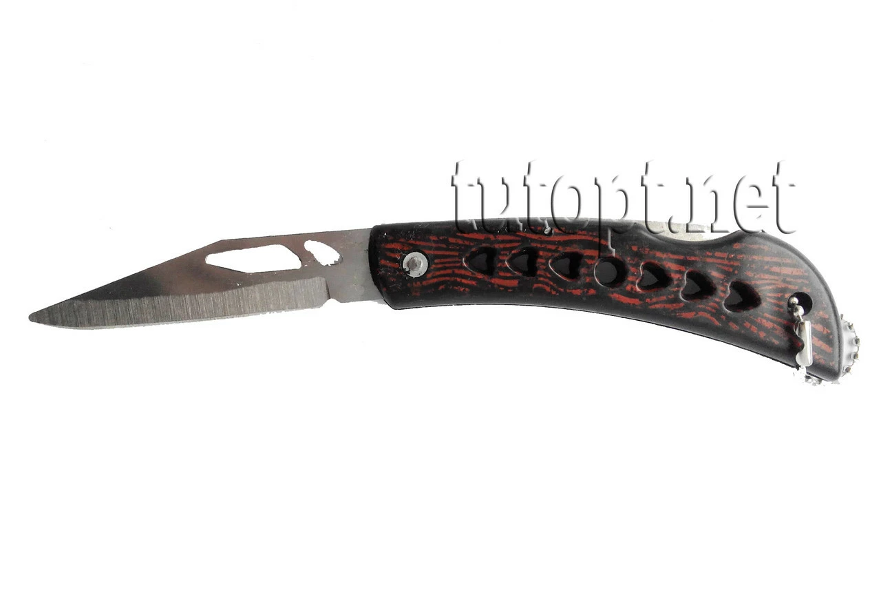 Нож складной с пластиковой ручкой под дерево. Имеется цепочка в рукоятке. Размер ножа в разложенном состоянии 17.5 см. В сложенном -10 см.