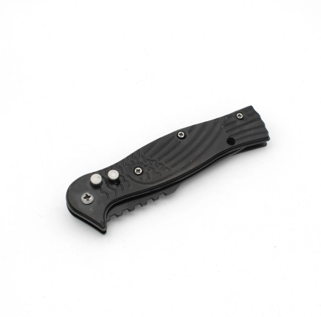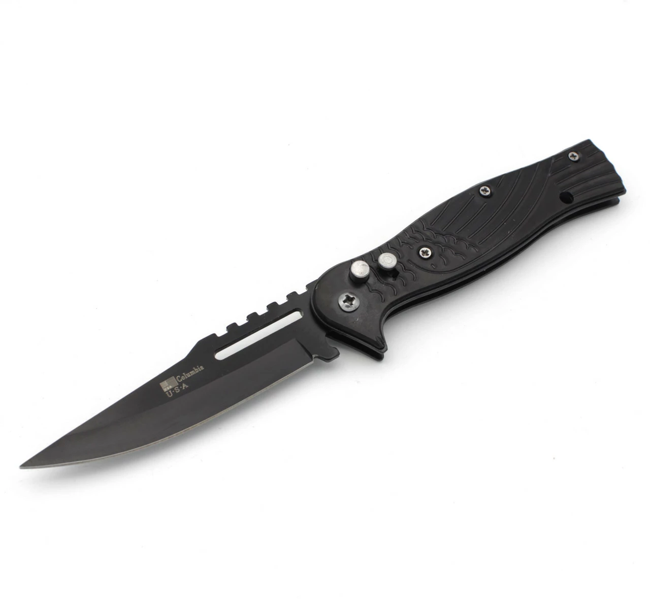 ВЫКИДНОЙ НОЖ V50 металлический. Имеет размер в сложенном виде 12 см. В разложенном - 21 см. Есть фиксатор на пояс. Высокопрочный нож. Оптовый товар.