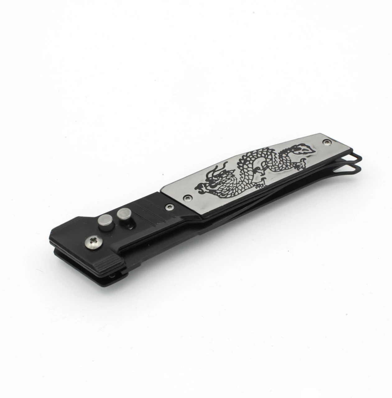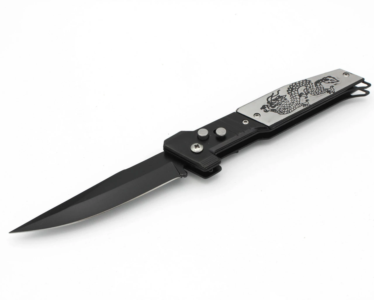 Выкидной нож черный с фиксатором №L21. Стальной нож с высоким качеством. Габариты в сложенном виде 13 см. Достаточно тяжелый в своем роде. В разложенном состоянии имеет длину 22.5 см. Есть крепление для пояса. Упакован в коробку.
