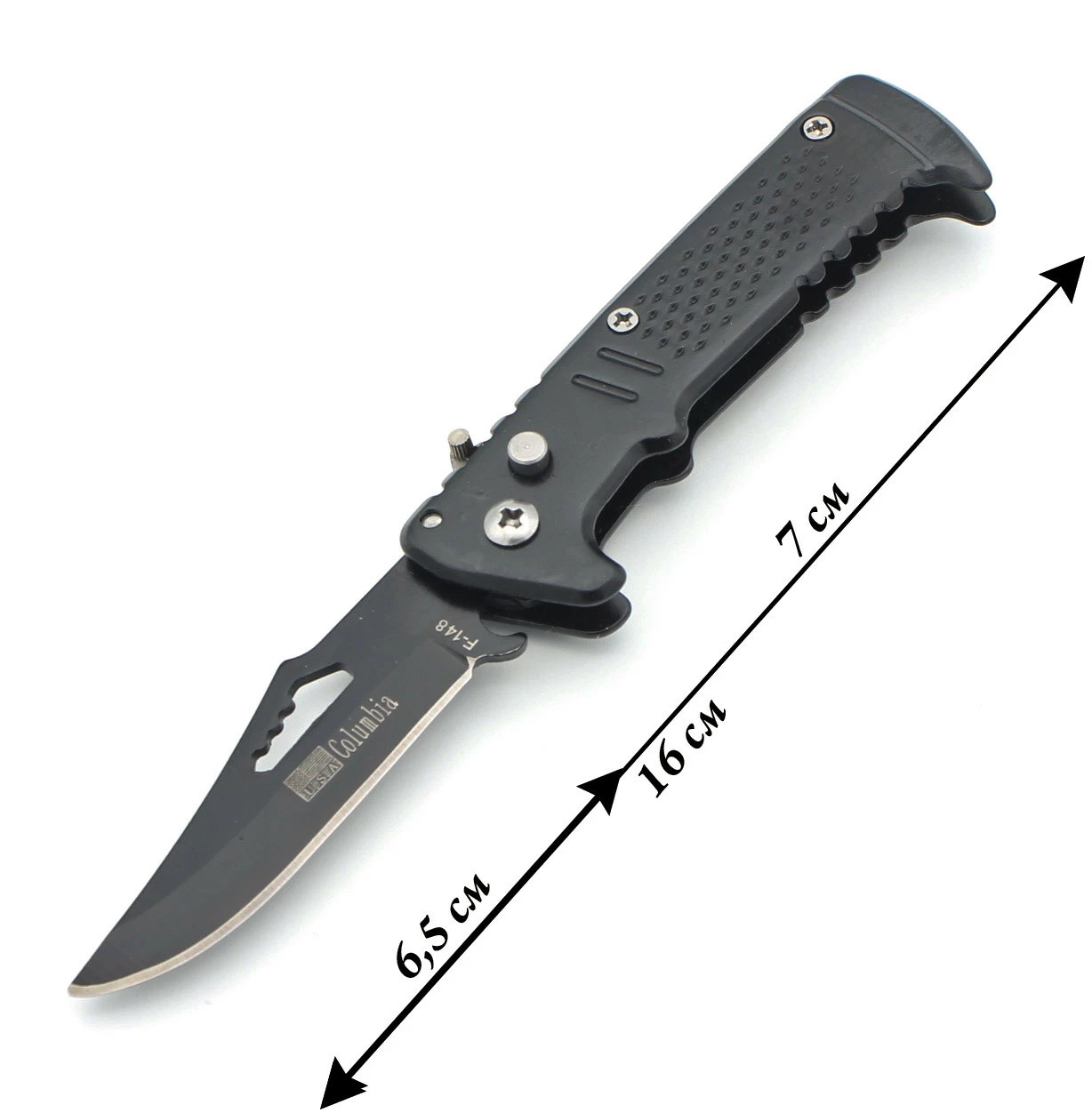 Выкидной нож с длинной 15см. В сложенном виде габариты 9см. Есть