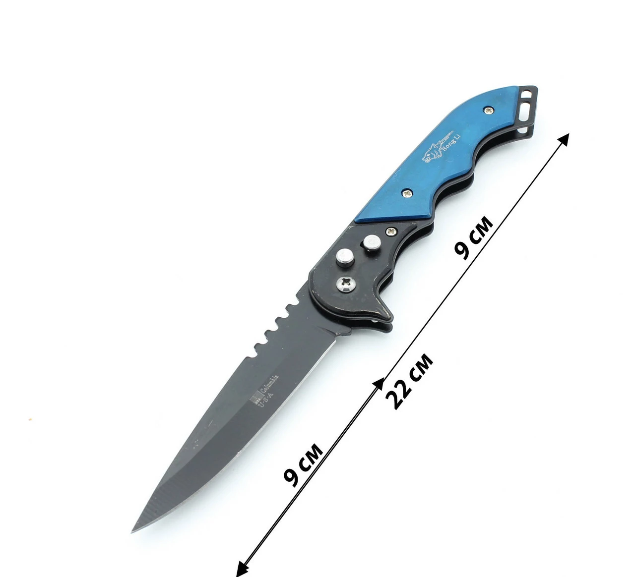 Нож выкидной Синяя пантера A515 - один из лучших моделей ножа. Пользуется большим спросом среди наших клиентов. Размер в сложенном виде 12 см, а при раскрытии лезвия - 22 см. Быстро реагирует на кнопку. Есть предохранитель. С оборотной стороны есть крепление на пояс.