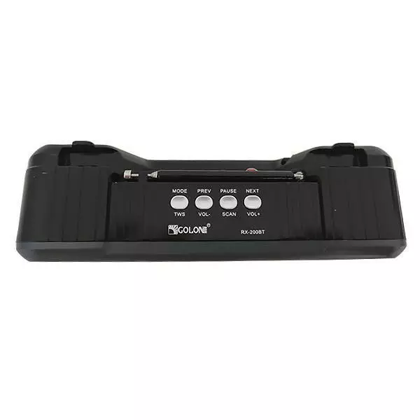 В бумбоксе Golon RX-200BT есть FM приёмник с автосканированием радиостанций, USB разъём используется для воспроизведения с флешек, microUSB – для зарядки колонки. В портативной колонке Golon RX-200BT 2 динамика размером 51 мм, но подключен только один – второй выполняет роль пассивной мембраны для усиления басов. В Голон-200 также есть функция TWS – это даёт возможность передавать музыку с этой на любую колонку или блютуз наушники с функцией TWS. Работает колонка от встроенного аккумулятора 18650, который может заряжаться от USB или адаптера 5V 1A. От аккумулятора, без подзарядки работает до 6 часов, время работы зависит от громкости.