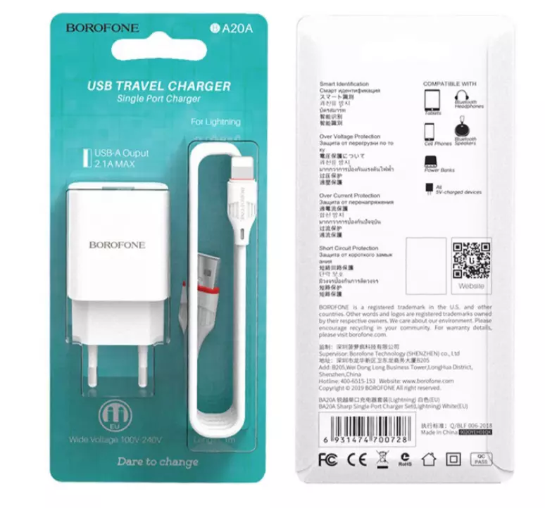 СЗУ Сетевое Зарядное Устройство BOROFONE BA20A Sharp - это настенное зарядное устройство с одним портом USB, которое обеспечит быструю и удобную зарядку вашего устройства. Оно поставляется с кабелем BX17: USB-C 1м / Lightning 1м / Micro-USB 1м, что делает его универсальным и удобным для зарядки различных устройств.