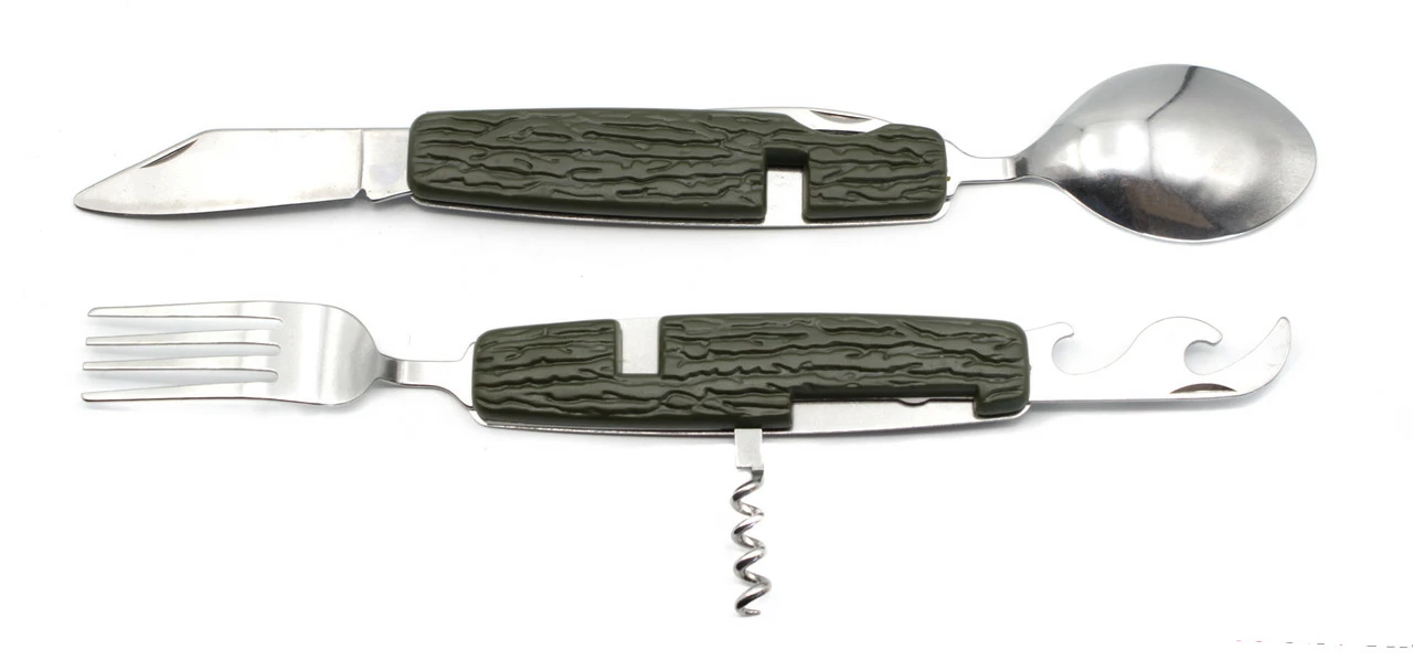 Мультитул имеет ложку, вилку, ложку, чайную ложку и другие полезные штучки. Достаточно прочный мультитул. Отпускается оптом.