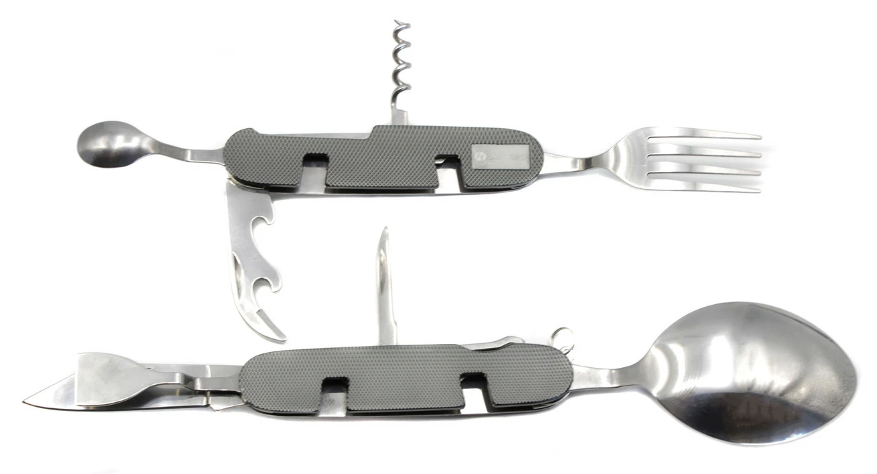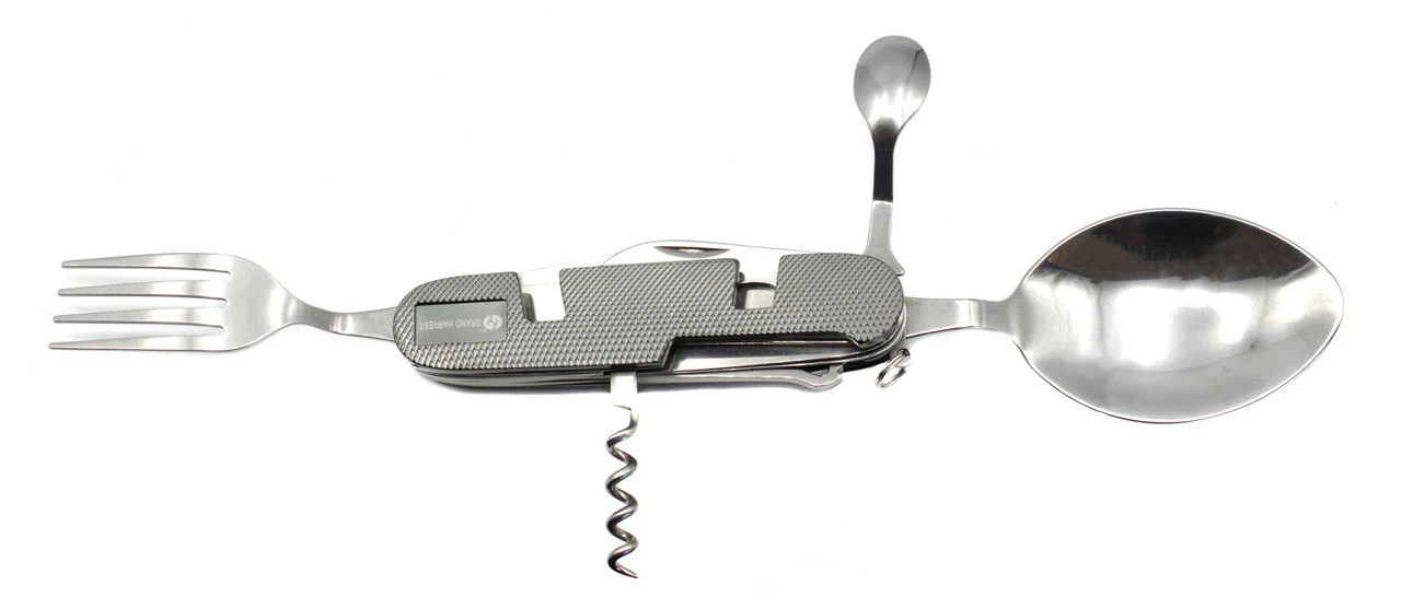 Мультитул имеет ложку, вилку, ложку, чайную ложку и другие полезные штучки. Достаточно прочный мультитул. Отпускается оптом.