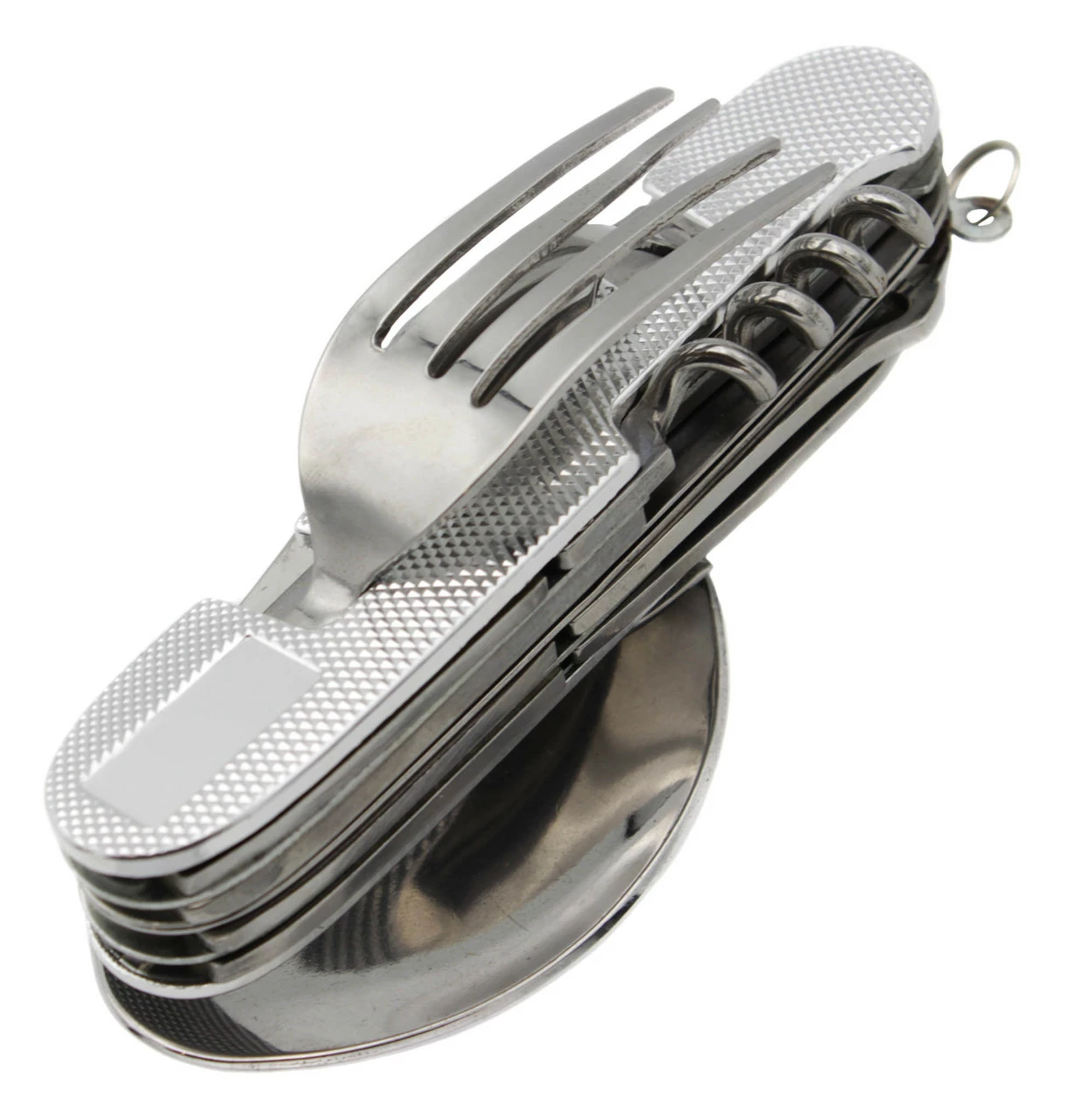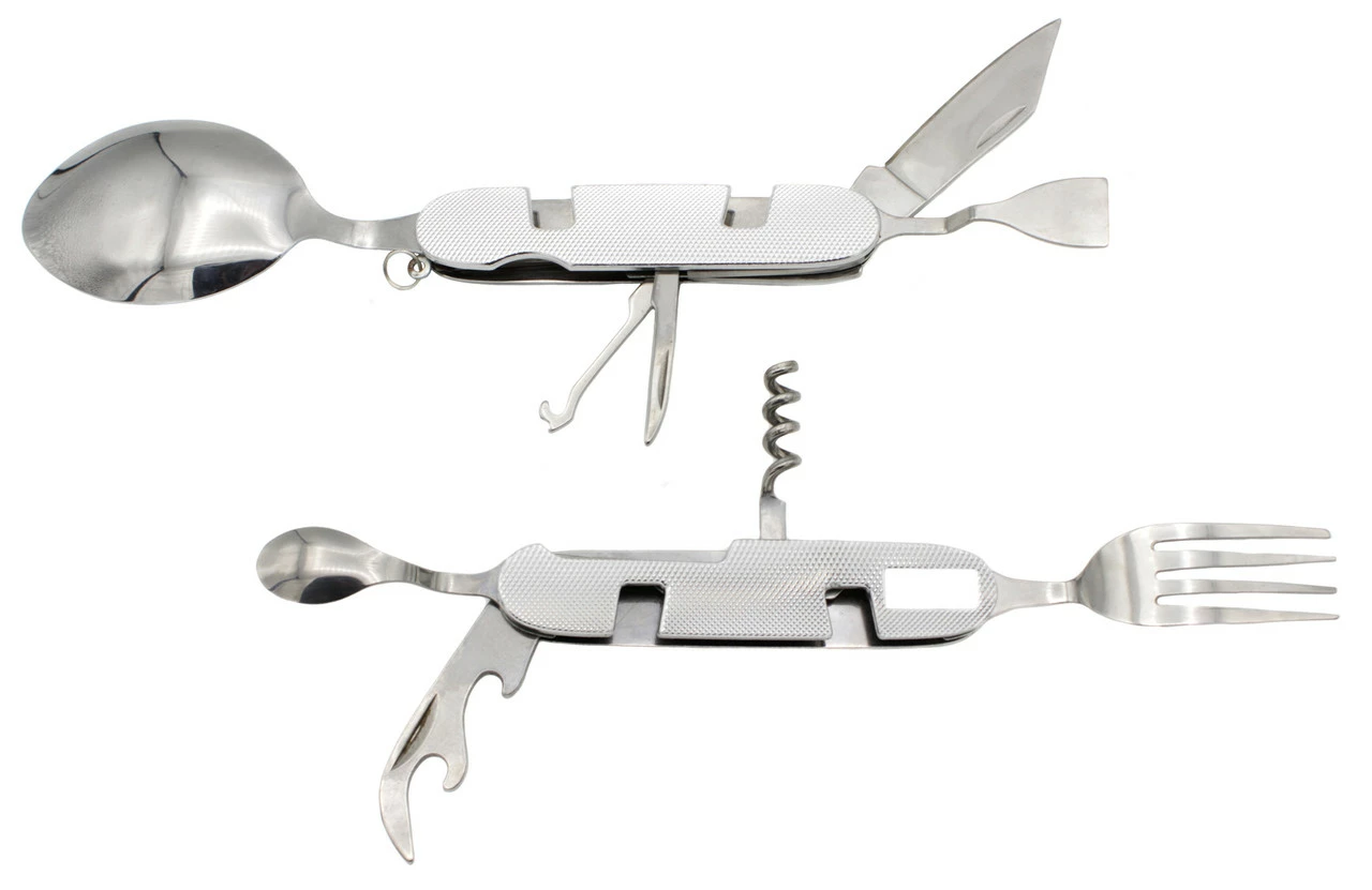 Мультитул имеет ложку, вилку, ложку, чайную ложку и другие полезные штучки. Достаточно прочный мультитул. Отпускается оптом.