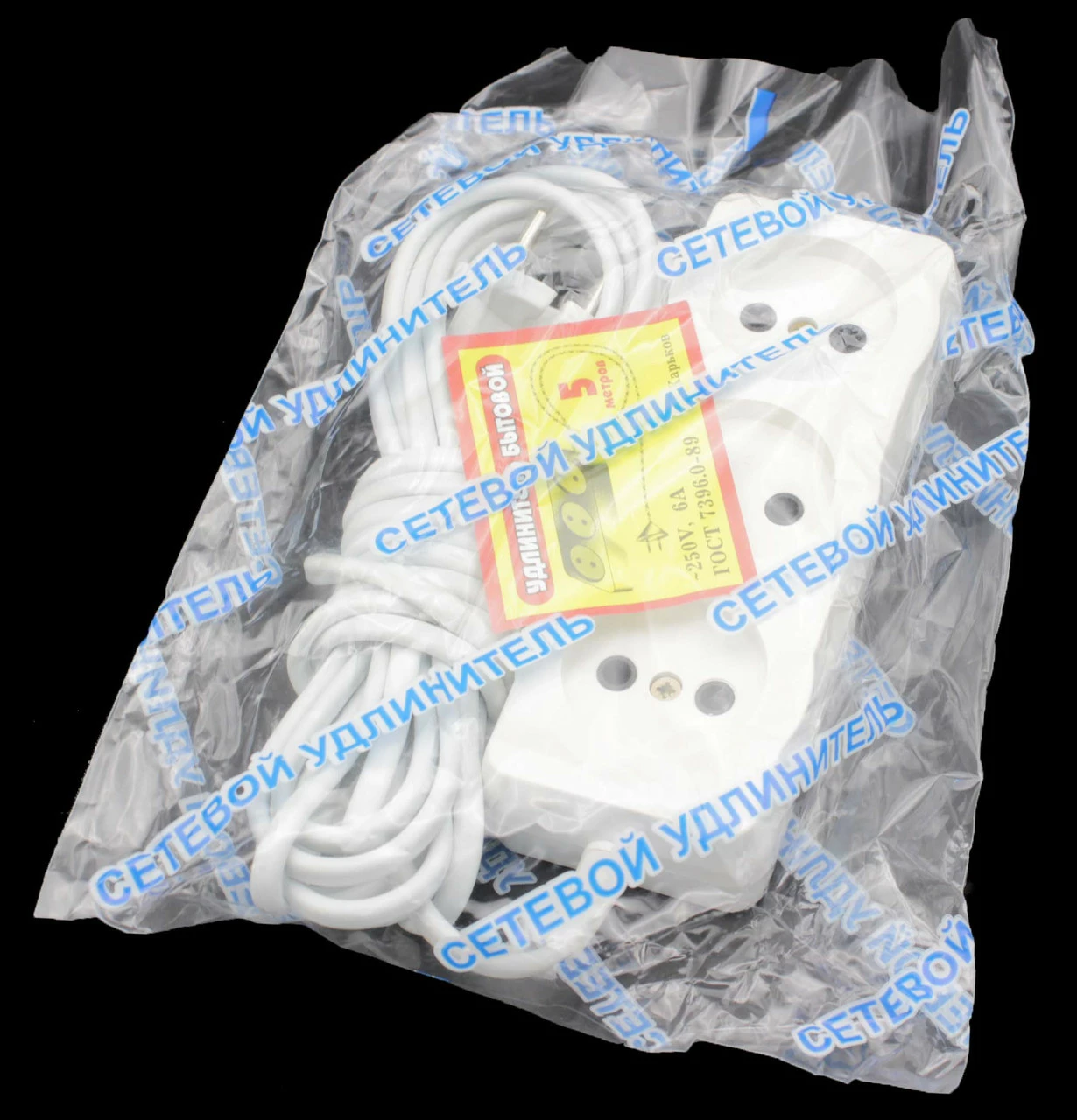 Удлинитель белого цвета. Имеет три розетки. Качественный удлинитель с высоким коэффициентом выносливости. Длинна данного удлинителя пять метров.