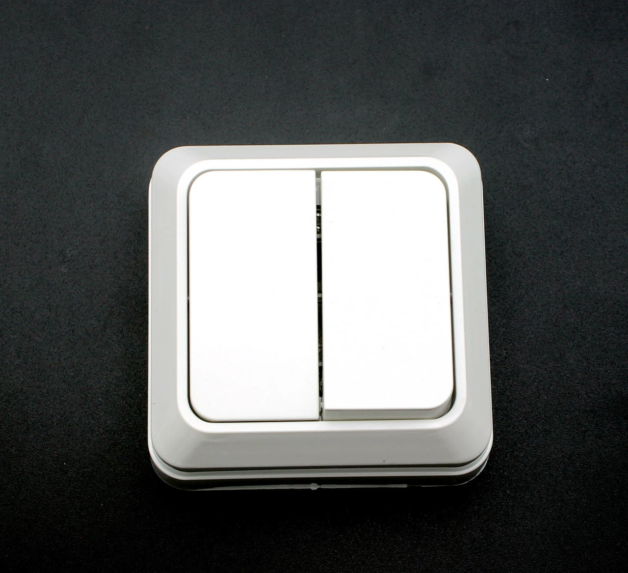 Двойной выключатель белого цвета с подсветкой. Крепление накладное. Прочный материал. Размер товара 7х7 см.