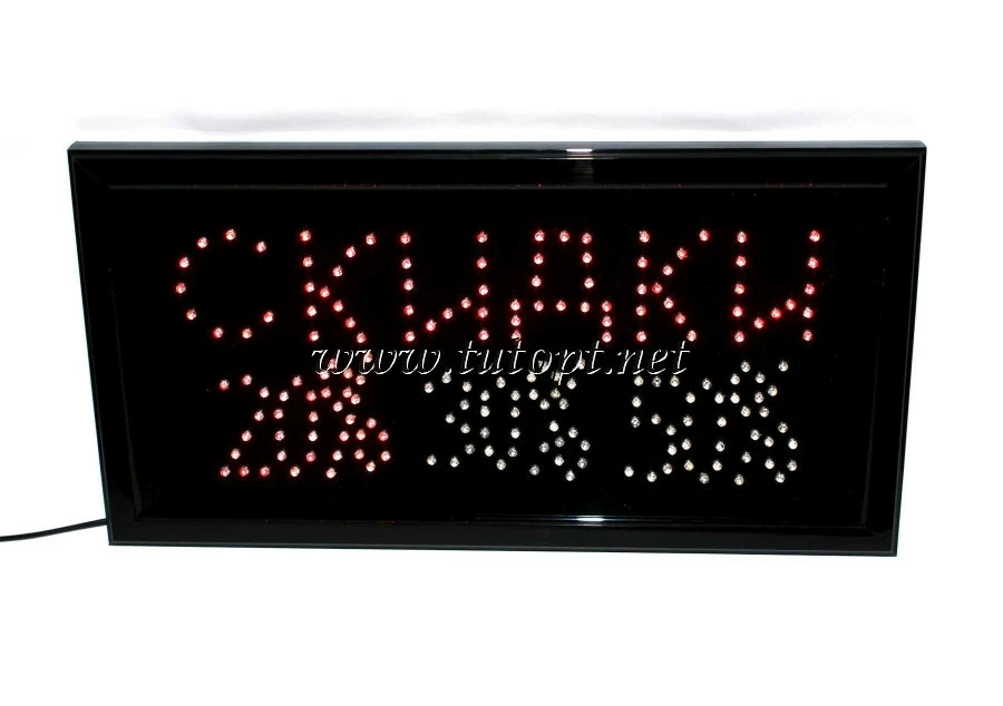 Вывеска СкидкиСветодиодные таблички применяются в коммерческой сфере для рекламы и привличения внимания к Вашему бизнесу. Как правило их вешают на витражи, фасады в качестве носителей информации. Они представляют собой легкие панели из ПВХ или оргстекла со встроенными светодиодами, с питанием от сети. Лампы устанавливаются в определенной последовательности, создавая слово или знак, например «Открыто». Разнообразие цветов светодиодных элементов позволяет создать яркую красочную табличку, которая мигает и меняет цвет. Светодиодные таблички это- самый оптимальный способ привлечь внимание с минимальными вложениями.